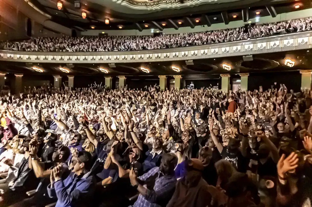 After The Horn leave there’s a film, “A Boomtown Fillum,” about The Boomtown Rats to wake us up before the band take the stage. There’s an introductory film clip showing a rat running around the tiers of a birthday cake, accompanied by Happy Birthday Boomtown Rats. The cake explodes and hordes of rats come flooding out. Eight Boomtown Rats are onstage cutting into Rat Trap. The line-up is somewhat expanded, with a real live saxophonist. They didn’t have one of those when I last saw them forty years ago. The choice of opening track makes me wonder whether this is going to be a pension-funding greatest hits set. Not a bit of it, as the opener is followed by I Never Loved Eva Braun from Tonic For The Troops (1978). This ironic song was considered rather controversial at the time, and possibly still is.