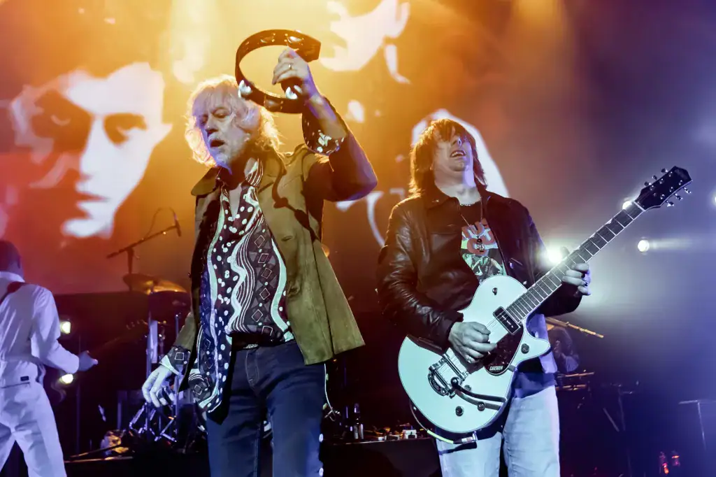 It’s audience participation time as the band play Against The World from 2021’s Out The Back Of Boomtown EP. Geldof asks us to sing “you and me against the whole fucking world”. We gleefully oblige. I’ve not heard the song before, and it sounds a bit Stonesy. It’s utterly storming though with a cracking distorted bass solo from Pete Briquette. We’re clearly roaring down the closing straight as the band dive into a fast and powerful She’s So Modern, before Banana Republic. This song is about Ireland, and briefly got them banned from playing in the country in 1980. The lyric “black and blue uniforms, police and priests” probably tells you all you need to know.
