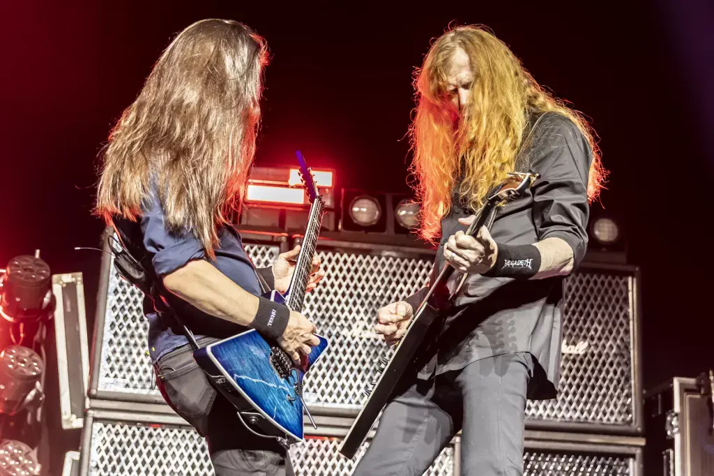Disturbed bring their tour to mark the 25th anniversary of the release of their debut album The Sickness to London’s O2 Arena. Surprisingly — and luckily for us — in support they bring thrash metal legends Megadeth. However, the moment they take to the stage at the O2 is not my first encounter with the band today. Megadeth have stepped into the world of brewing, and today they have a launch event for two new beers — and I am one of eighteen lucky souls invited to a press conference to mark the launch. This takes place in a hotel near the arena, where we are invited to taste the beers and witness a Q&A session between the band and journalist Phil Alexander. We are invited to submit questions on the understanding that “only one or two of them” will be addressed. Also, as the focus is on beer, the band will not answer anything regarding next year’s tour or their forthcoming album.