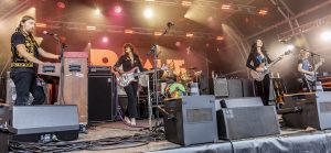 Opening the Firestarter Stage were Big River. The band comprises lead vocalist, Adam Barron (ex Mick Ralphs Blues Band), bass player, Simon Gardiner, guitarist Damo Fawsett and drummer Becky Scott. Having had to drop out of Maid of Stone in 2024, it was clear that they intended to make up for that with a strong and enjoyable performance. They have some killer songs, such as Don’t Hold Out which enabled the band to produce a more relaxed mode, complete with Mandolin, before they cranked up into some head-down, raw and potent rock and roll.