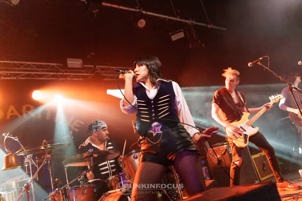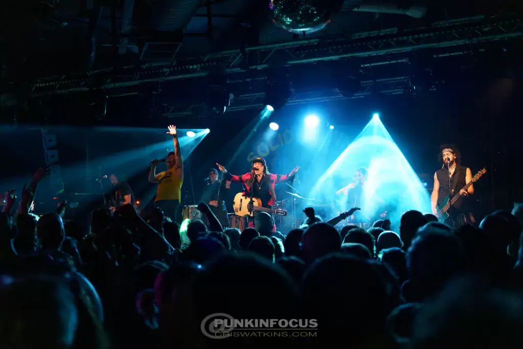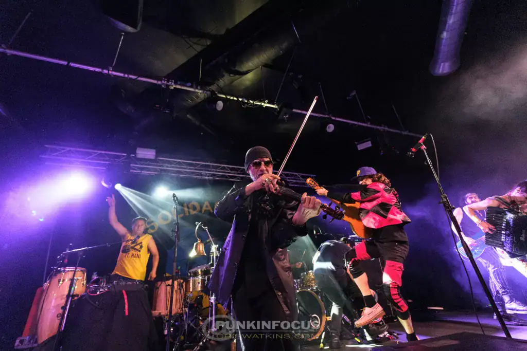 Ignition follows — another new piece, with a violin intro and Erica switching from accordion to synth (don’t panic, this isn’t a new electronica direction). Eugene is on electric rhythm, and Pedro introduces Immigranada (We Comin’ Rougher), which starts dub-flavoured before bursting into punk-rock urgency. A grumpy tech wrestles with misbehaving monitors while We Mean It Man — yet another new song — celebrates gypsy-punk unity. The Puzzled Panther girls return as Eugene hands his guitar to Kay mid-song. She doesn’t flinch, of course.