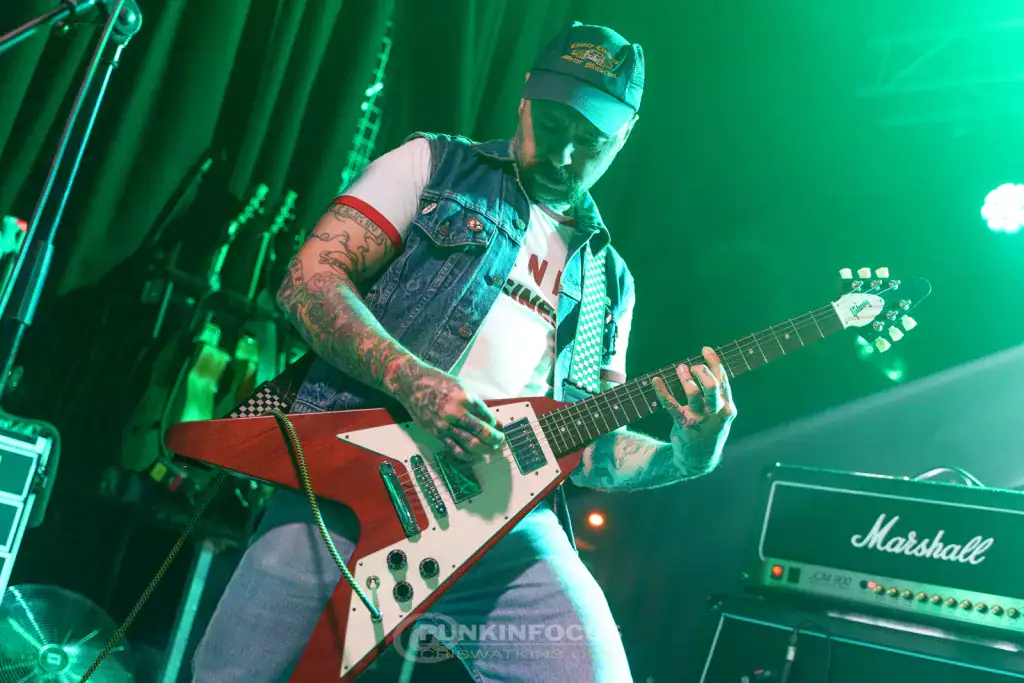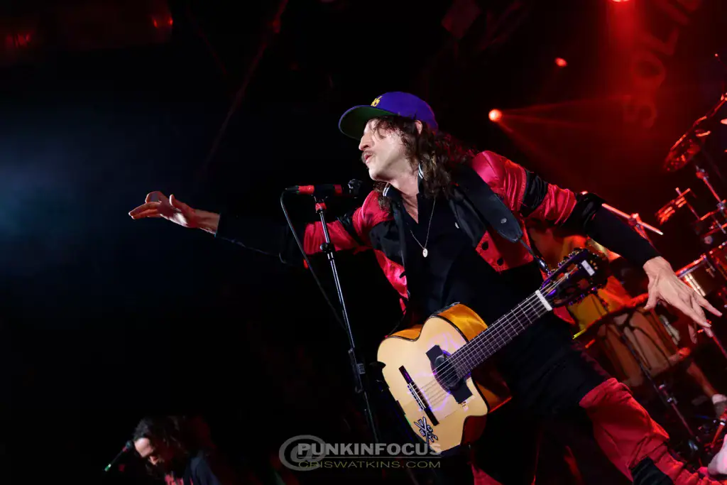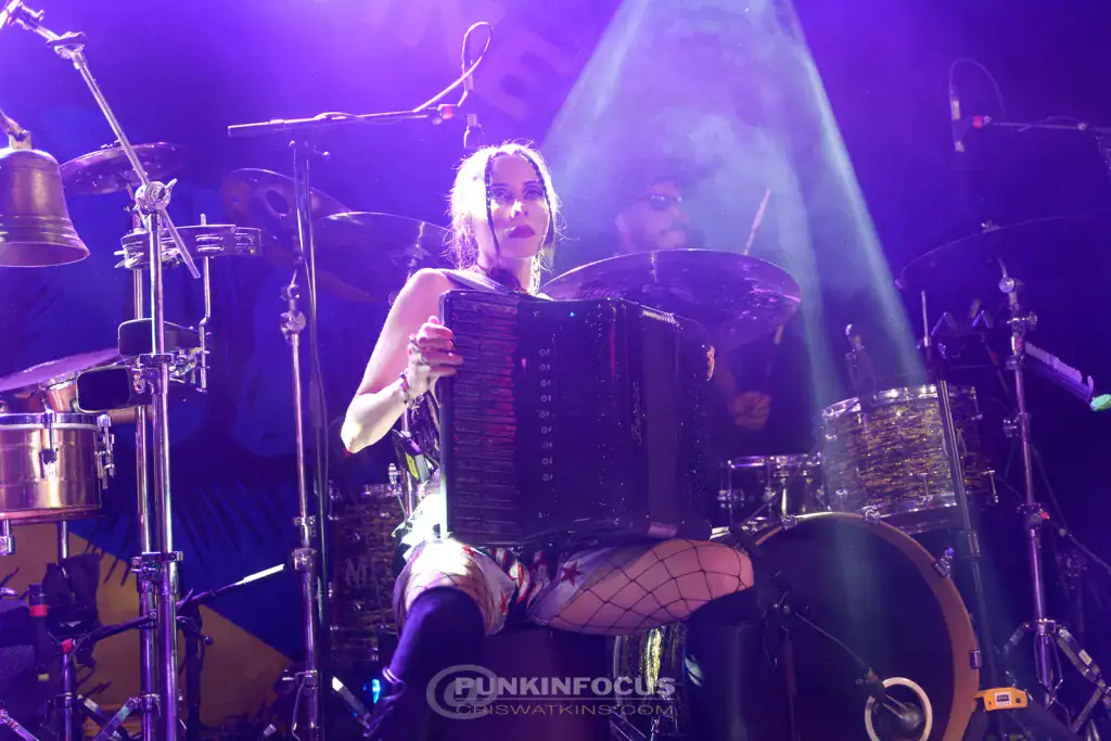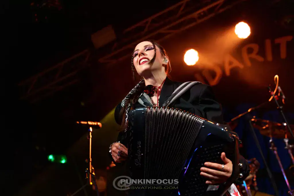 For I Would Never Wanna Be Young Again, Pedro Erazo joins in on vocals before hammering out a tattoo on the tom-toms. The song, from the wonderfully titled Gypsy Punks: Underdog World Strike, reinforces Gogol’s role as champions of the underdog — a cause that feels ever more vital. Not A Crime, from the same album, showcases their musical diversity. Leo Mintek plays a harmonics-based solo, Erica Mancini delivers a joyous accordion solo, then Leo returns for a more complex guitar part. There’s always something fascinating to see or hear; even in prime position, it’s hard to keep up! Immigrant Punk takes on a reggae groove, while Eugene commands the crowd like a shamanic showman. During My Companjera he has us swaying — at least until the tempo erupts again!