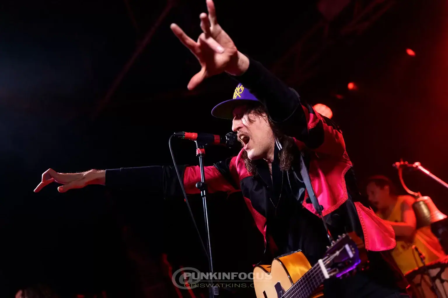 Eugene picks up his acoustic for Mystics, possibly another new number. A furious acoustic intro and Sergey’s soaring violin lead into a full-band frenzy. At times, everyone but the drummer crowds the front, absolutely having it. Leo delivers a searing solo, hammering on with just his left hand, while sporting a GBH T-shirt — a nice touch. Sergey then takes a solo spotlight, centre-stage, before the band rejoin for a roaring coda. Someone lobs a leather jacket into the pit — an offering, perhaps? For Mishto! Eugene whips off his shirt to widespread delight. The Puzzled Panther singers return for shared vocals, Pedro straps on a bass drum, and Leo and Kay trade psychedelic solos. It’s glorious chaos.