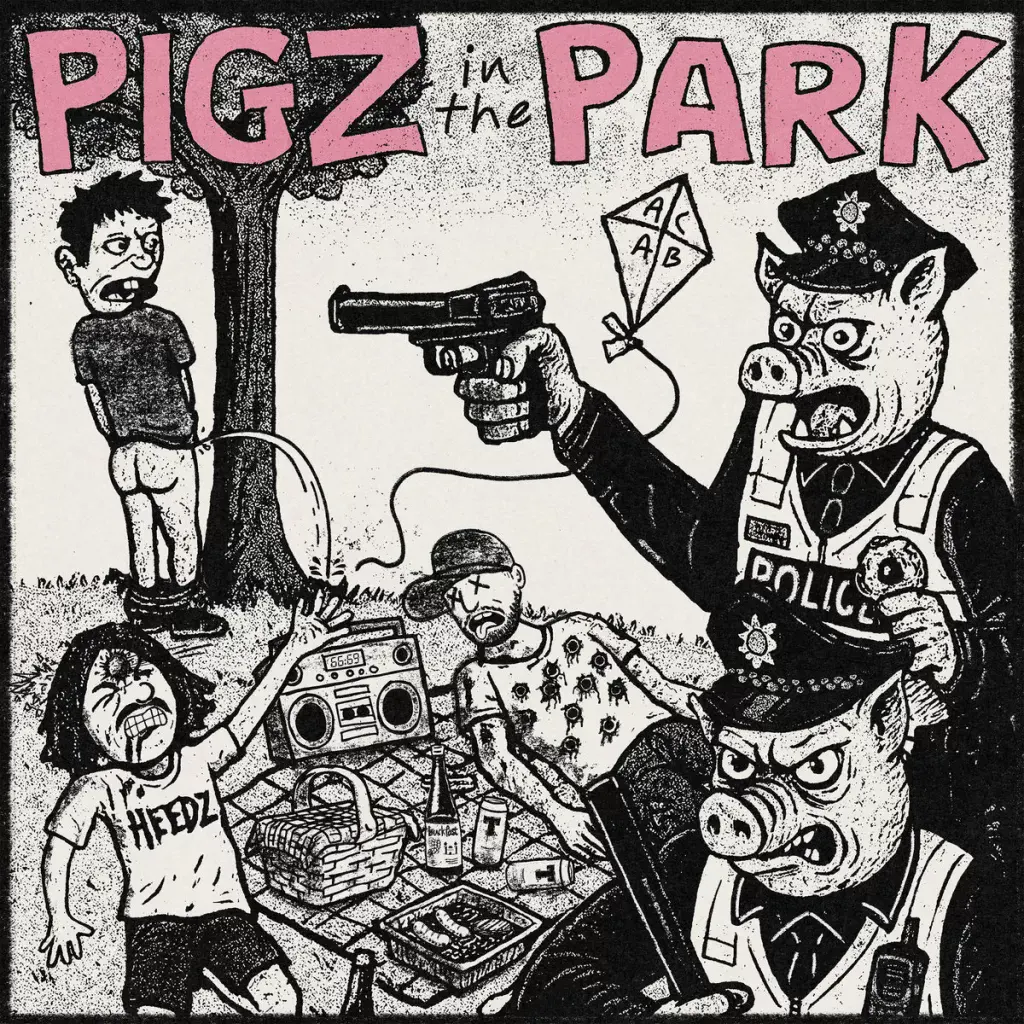 HEEDZ are back with another blast of riotous punk fury in the form of “PIGZ IN THE PARK”, a true cautionary tale for our times. A chilling, tongue-in-cheek glimpse into a Britain gone mad—where opening a cold Tennent’s in the sunshine is treated like an act of terrorism, swigging Buckfast on a bench gets you exiled, and taking a quick piss behind a tree might earn you public execution.