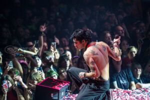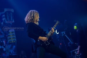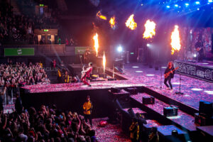 The song’s thundering percussion and ominous riffs pump through the packed arena, setting an exhilarating tone. As they launch into Death or Glory from their latest album, the energy is relentless, with Remington and Sebastian darting across the stage, firing up the crowd as they charge down the extended catwalk. The stage has two levels; drummer Emerson Barrett is elevated stage left with tour guitarist Dave Green.