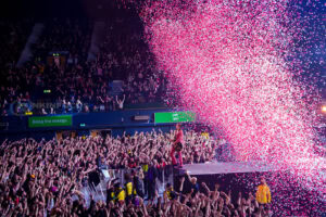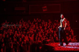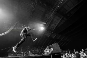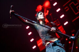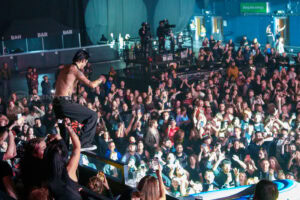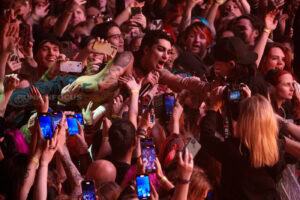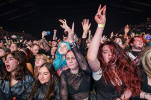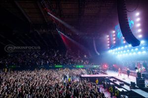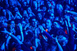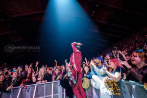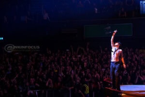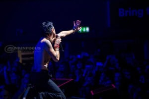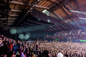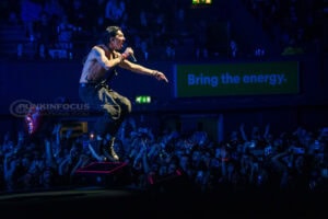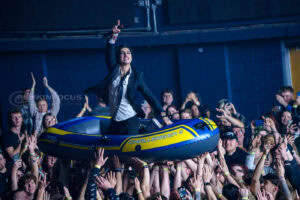 One unforgettable moment arrives when Remington, not content to stay confined to the stage, hops into a rubber dinghy that floats over the outstretched hands of fans. During “Oblivion,” the arena becomes a constellation of smartphone lights as Remington holds centre stage under a lone spotlight—a visually arresting contrast to the night’s earlier chaos.