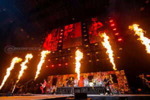 Meanwhile, bassist Logan Baudean remains on the lower level and stage left, and these members stay pretty much static throughout the performance. The set comprises many tracks from the new album, with oldies peppered through the set. Little Bastards slows the pace until Leith heckles the crowd to open up a circle pit, and on the refrain’ run run run you, little bastards,’ the crowd duly obliged by smashing into each other, and again, pyros fill the stage. Highlights are plentiful, including a superb run-through of Dark Side of the Silver Spoon, a playful romp reminiscent of Queen with a cheeky nod to Mott The Hoople during the refrain.