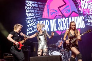 Next up in the Opera House are Syteria, who feature Jackie Chambers from Girlschool on lead guitar. They describe themselves as a pop-punk band, but I can also hear 1970s glam-rock influences in there as well. They have some utterly amazing four-part harmonies, of the kind of quality that you don’t normally hear outside of a choral setting, and certainly much better than you would normally hear from a rock band. Vocalist Julia Calvo’s vocals are also awesome. She’s a great frontwoman too, frequently coming to the front of the stage, which not many people have done in the Opera House. There’s a large expanse of space in front of the monitors and mic stands on the Opera House stage. Julia has made it hers. There are not that many people in here tonight. They’re missing a treat. During a song that I think may be called ‘Beauty Is Cheap’, Julia views herself in a hand held mirror. ‘Sheep’ is very lyrically humorous, whilst during ‘Start The Revolution’ the band ‘machine gun’ the audience with their guitars. On new single ‘Monsters’ vocalist Julia also plays guitar. This has been a tight, powerful performance. The band have gigs booked from now through to November. They’re certainly worth seeing. Their third album ‘Syteria World’ is out now.