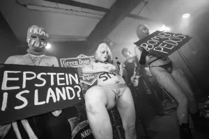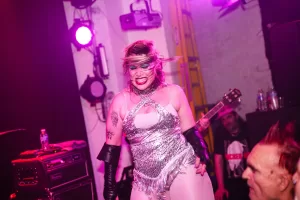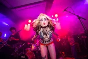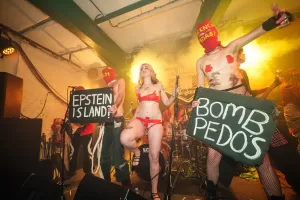 Shortly afterwards, the band joined the audience at the front, running through the mosh pit, all in the name of love. Words can’t fully describe the moment unless you were there, but Epstein Island and Bomb Pedos on the band’s placards projected in volume the message they were putting across. The band had their own balaclava-clad dancers and performers with them, and before we knew it the singer had joined them wearing nothing more than red gaffa tape on their particulars. It was all gloriously, chaotically anarchic, and I’m now a fully paid-up member of the French Toast club.