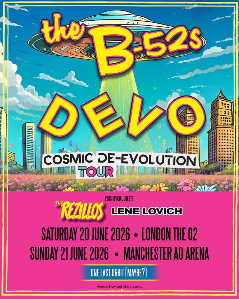 New wave royalty is heading to the UK. The B-52s and DEVO have announced two massive co-headline arena dates for June 2026, bringing their critically acclaimed Cosmic De-Evolution tour to London and Manchester. These exclusive UK shows will see the genre-defying legends joined by special guests The Rezillos and Lene Lovich for an unforgettable celebration of alternative music history.
