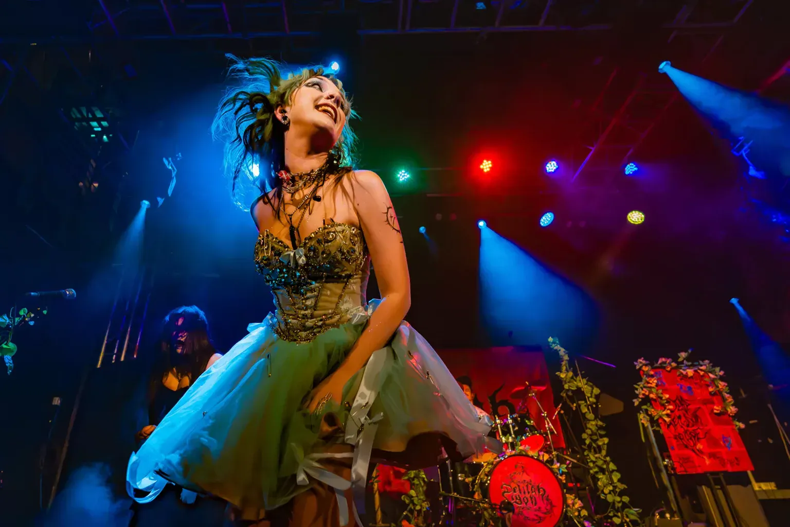 The night began with the gritty, high-octane energy of support act Crae Wolf, a force of nature who defines her sound as “Baddie Metal Core.” She didn’t just warm up the stage; she staked her claim. During her song Wolf, she transformed the audience into her own personal pack, inciting them to howl and bark in a feral call-and-response that threatened to tear the roof off. It was a masterclass in crowd control, a fierce, genre-blending set that perfectly primed the room for the chaos to follow – though ultimately, the evening belonged to Bon.