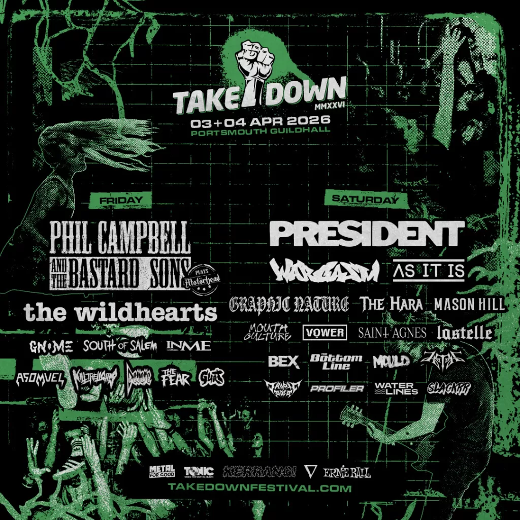 Takedown Festival 2026 takes place at Portsmouth Guildhall on Friday 3rd and Saturday 4th April. Tickets are available now via takedownfestival.com