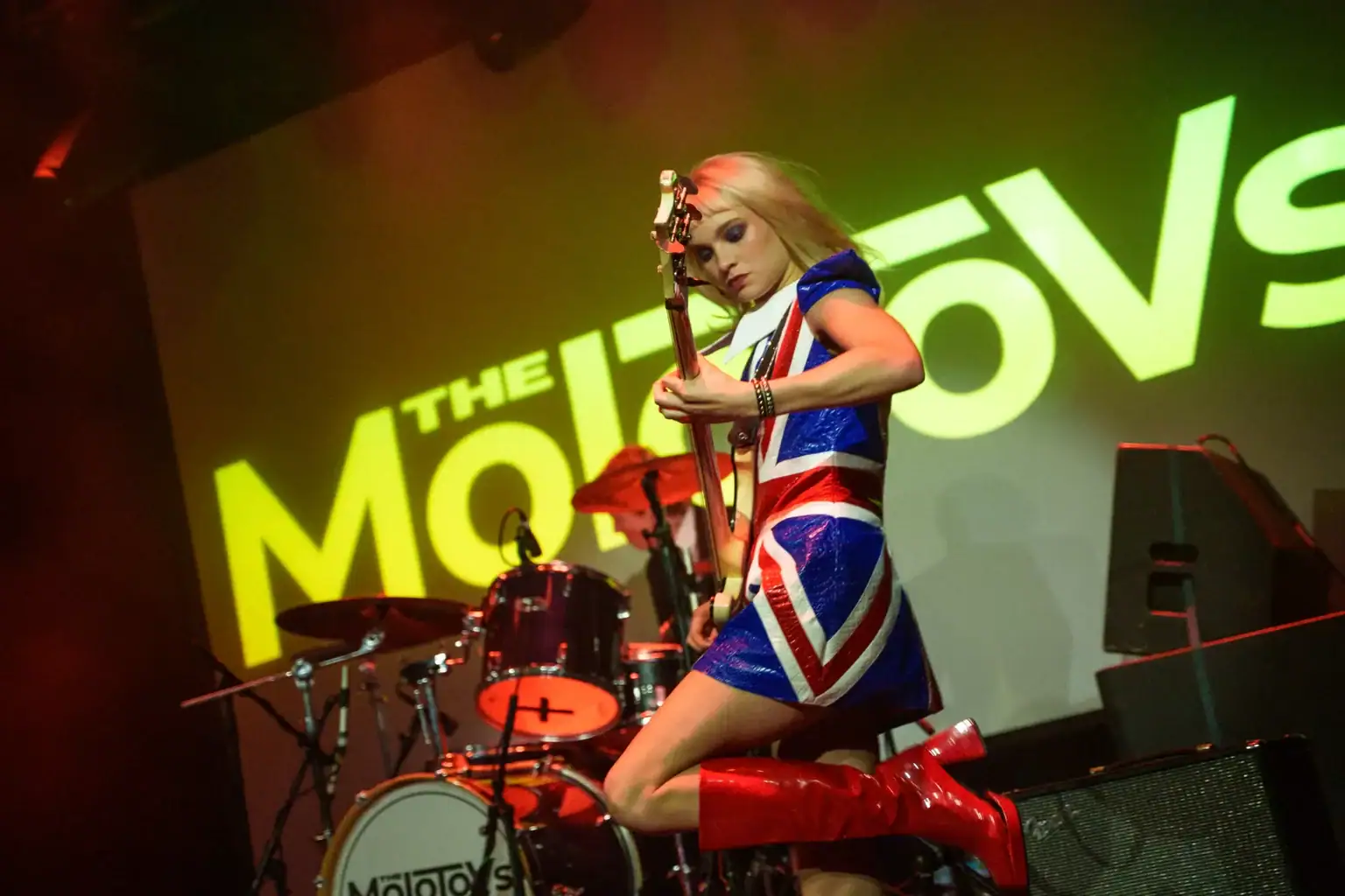 Wasted On Youth is the title track of The Molotovs’ debut album, which comes out at the end of January, and quite a few tracks from it have been played tonight. If what we’ve heard is anything to go by, it’s going to be epic!!! During Wasted On Youth Matt falls backwards over the drum riser whilst just about managing to continue playing! He seems unhurt and bounces up and carries on. More More More is one of the band’s earlier singles, and features a blistering solo from Matt whilst Issey machine guns the crowd with her bass. As the set reaches its close the energy and intensity just continues to rise. Come On Now just screams ‘classic!!’ and has a cataclysmic guitar ending, whilst encore Get A Life finishes with sustained feedback from Matt’s guitar, which he has dumped on the stage.